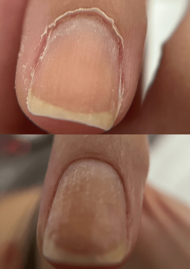 Cette technique permet de nettoyer et dégager la surface visible de l’ongle et donc de l’agrandir (l’effet est plus ou moins impressionnant en fonction des personnes). Ce que je préfère dans cette technique c’est son résultat irréprochable, en d’autres termes, des contours d’ongles nets et soignés, ainsi que des cuticules durablement éliminés.